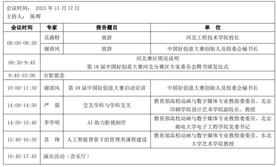 2023年11月17日,我校承办的第18届中国好创意大赛河北高校分赛区启动仪式于ag8九游会j9图书馆报告厅举行,现通知如下: